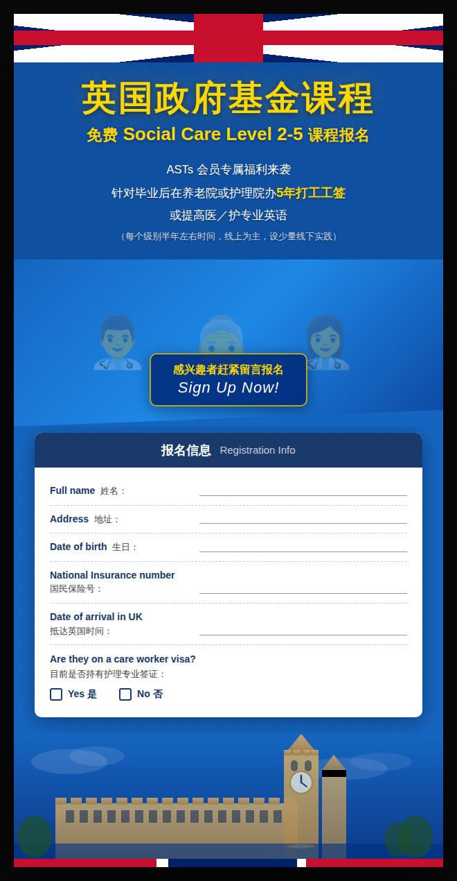 ASTs会员专属福利来袭,针对毕业后在养老院或护理院办5年打工工签,或提高医/护专业英语 (每个级别半年左右时间,线上为主,设少量线下实践。感兴趣者赶紧找我微信season292000报名。需要提供护照及以下信息。