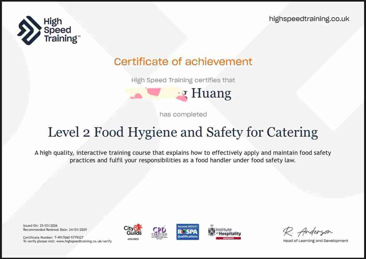 本人可帮助办理Level2/Level3food hygiene(餐饮食品安全卫生证书2级)是英国🇬🇧从事餐饮业的工作者必备证书。